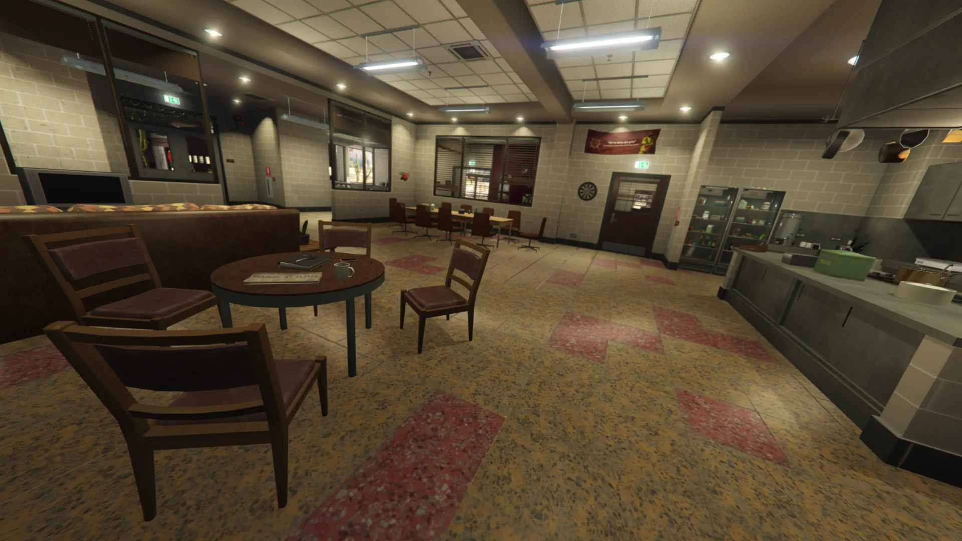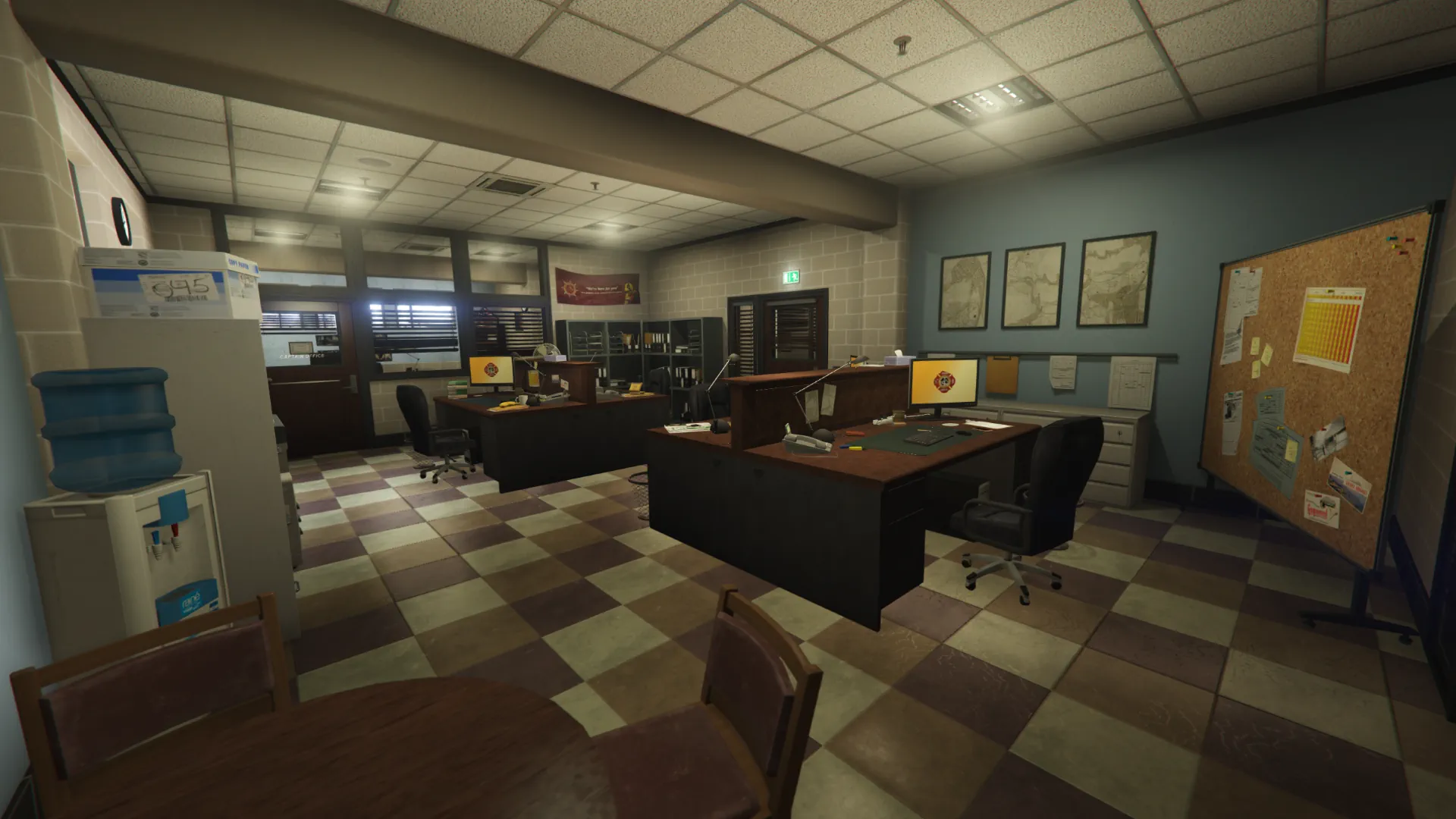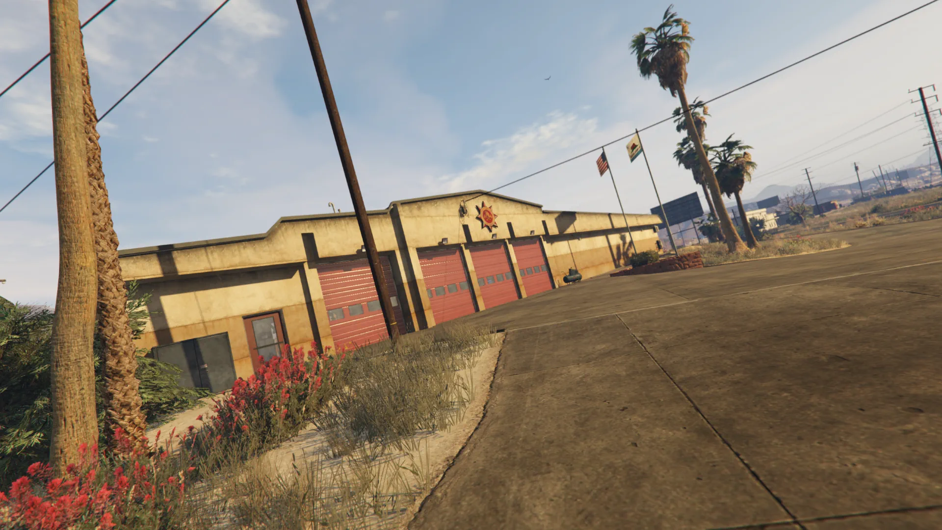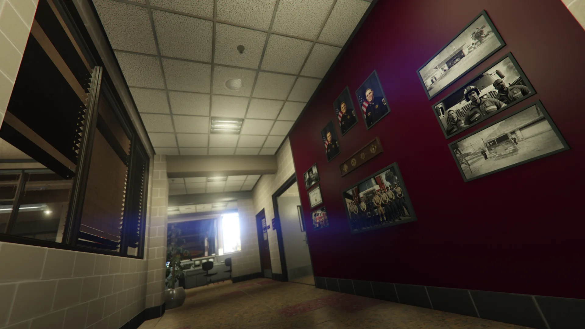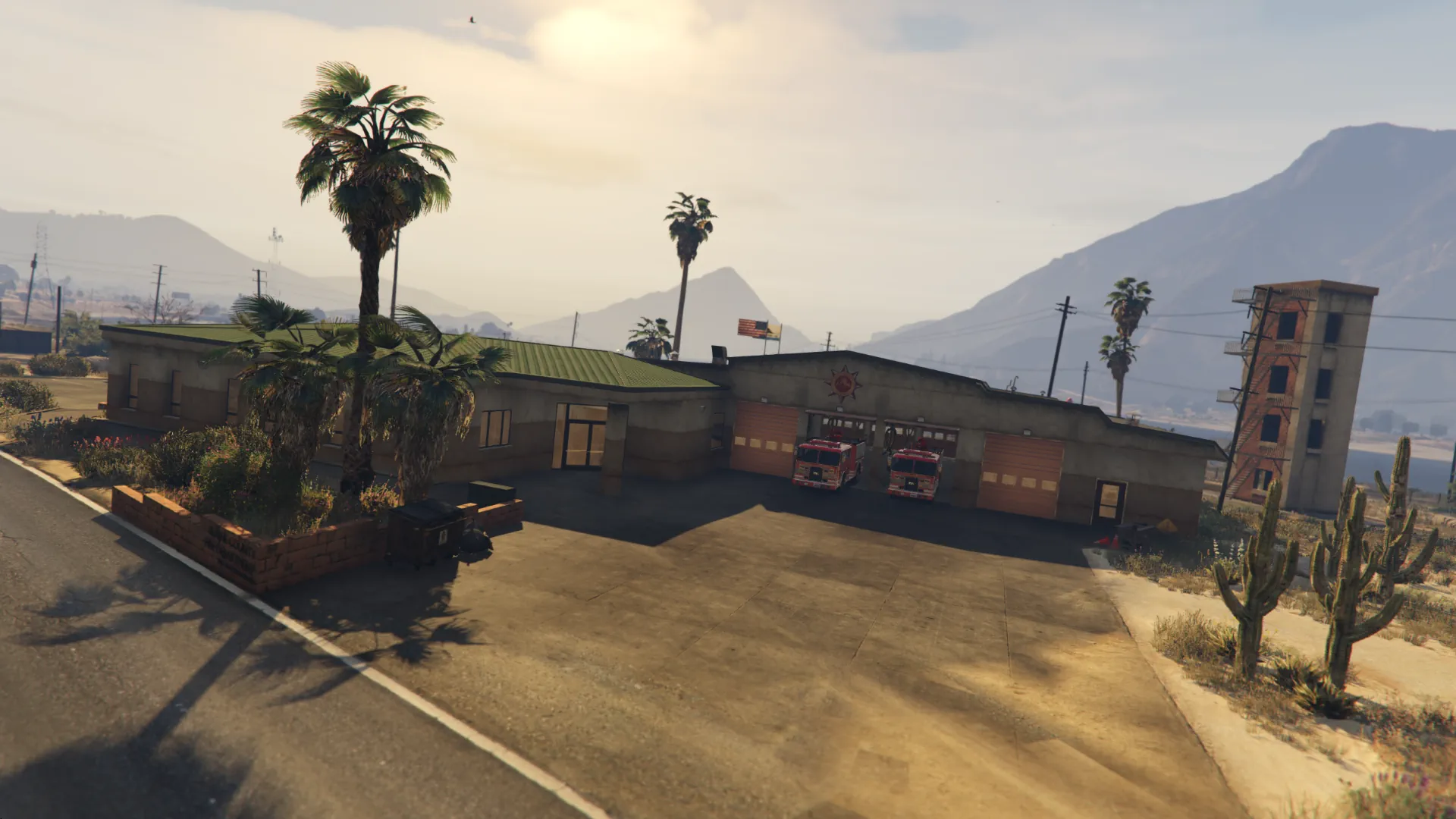 This product includes a fully equipped fire truck garage, dispatch office, lounge area with kitchen, locker room, showers, and crew quarters.